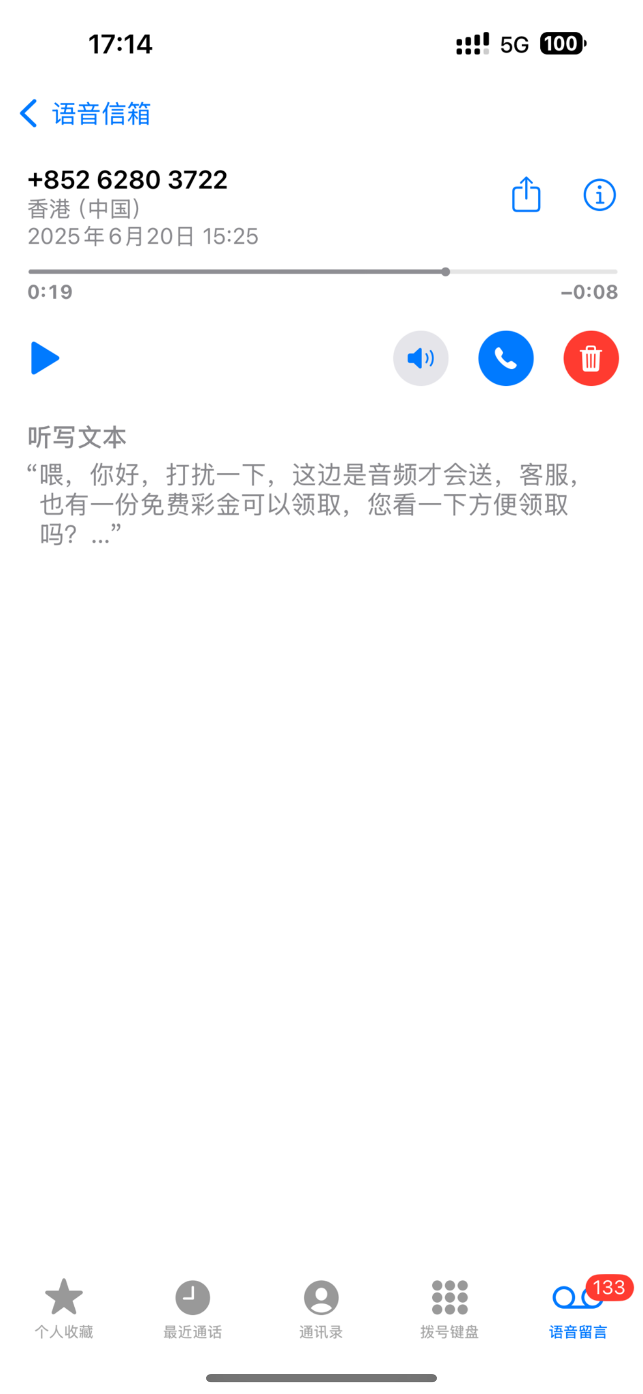 求今天打电话的这个香港号 送的是哪个台子的彩金 语音留言里他说是什么平台回访客服听不清楚