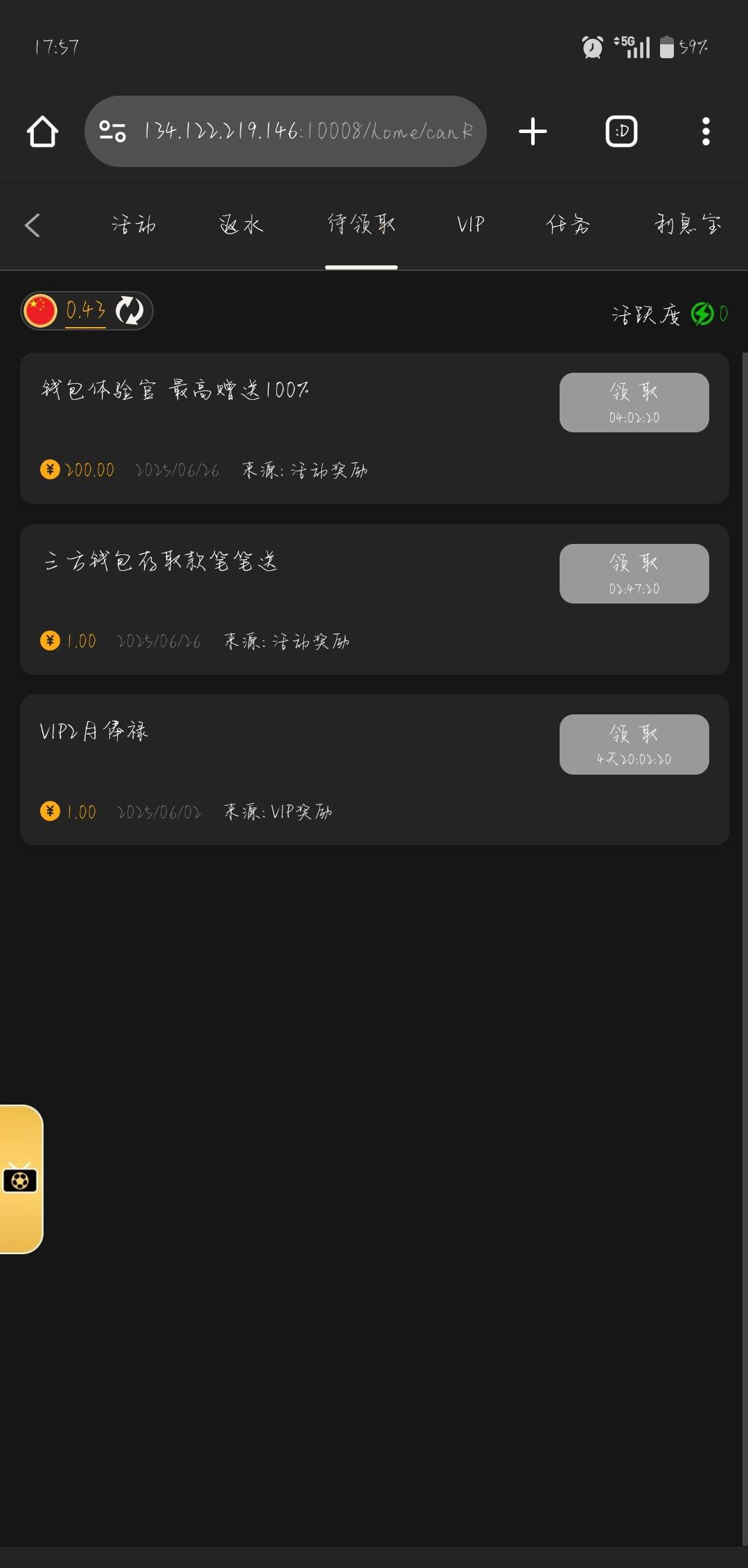 昨天上去领了18钱包回馈彩金出了两百