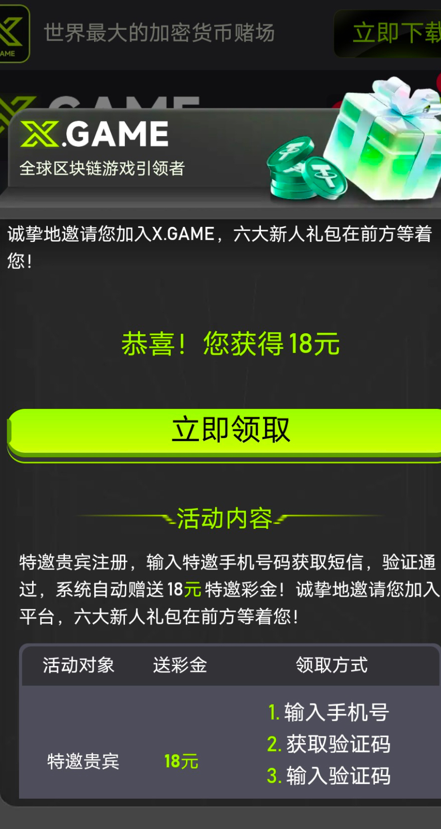 发彩信来的 首页有特邀入口验证手机号就行 短信特邀彩金18