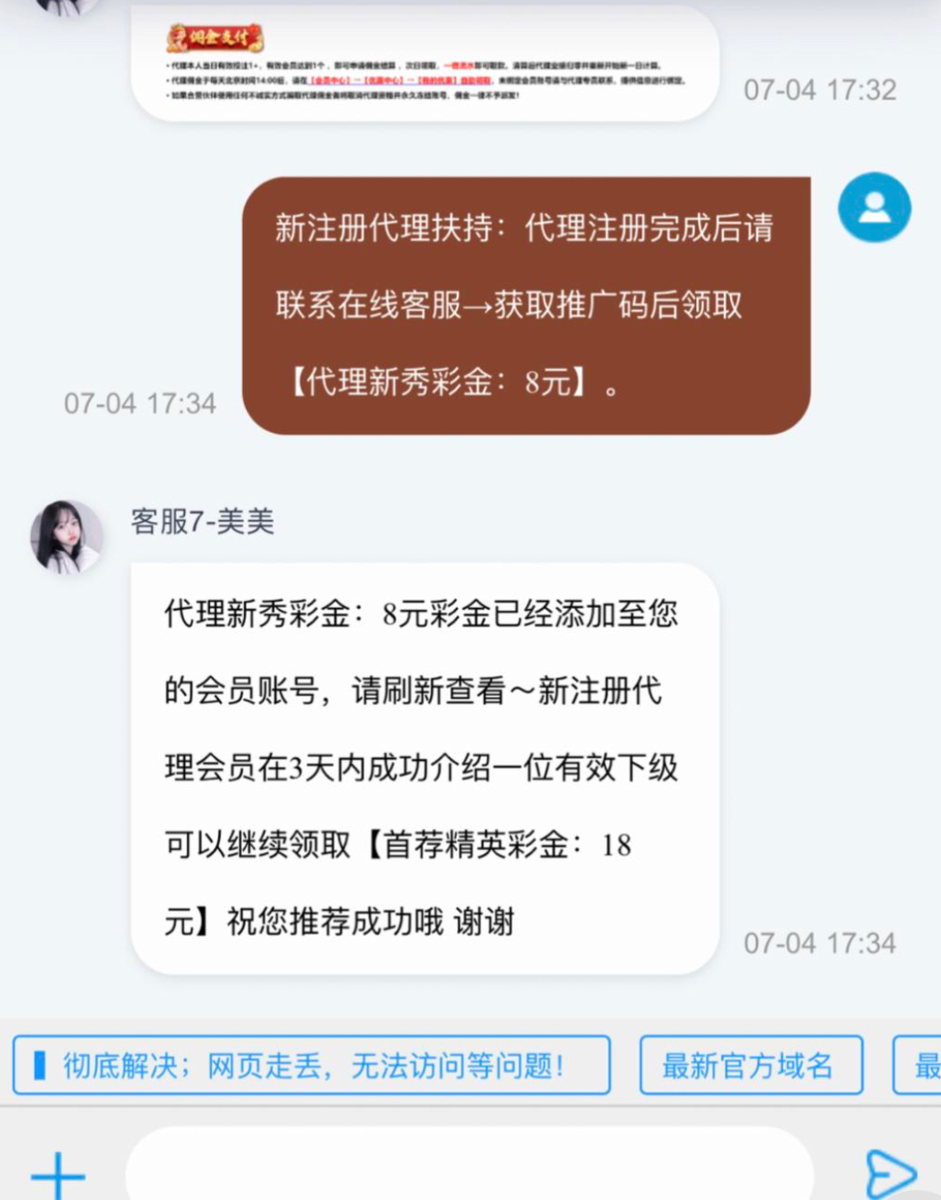 注册一个代理账号然后联系在线客服领8块代理新秀彩金 不需要充值不需要拉人 彩金一倍水10块钱就能提现