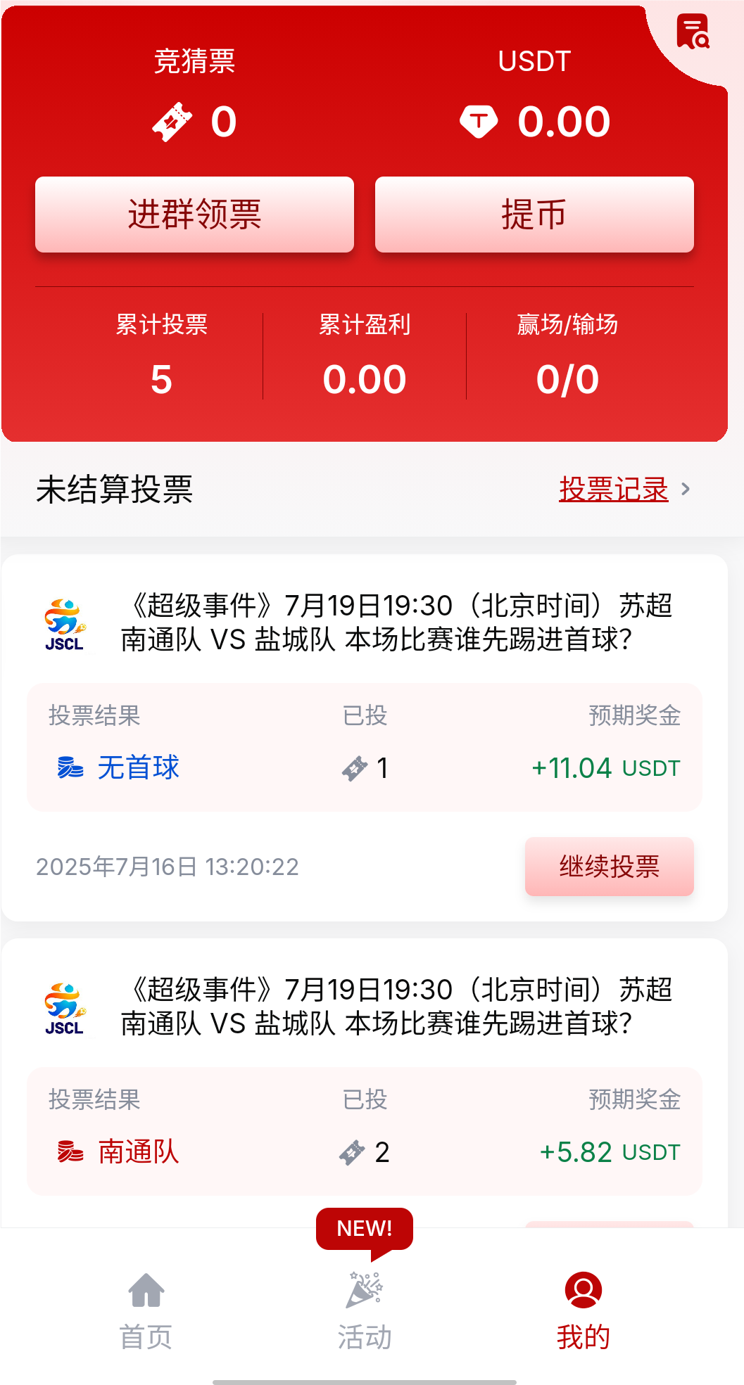 注册汇旺投票,把任务两个做了给六票,直接投票自己想投的,六票大概4-5 u左右,汇旺提现需要1u,链上需要2u手续费,不想提的可以继续在竞猜哪里打,提现稳定