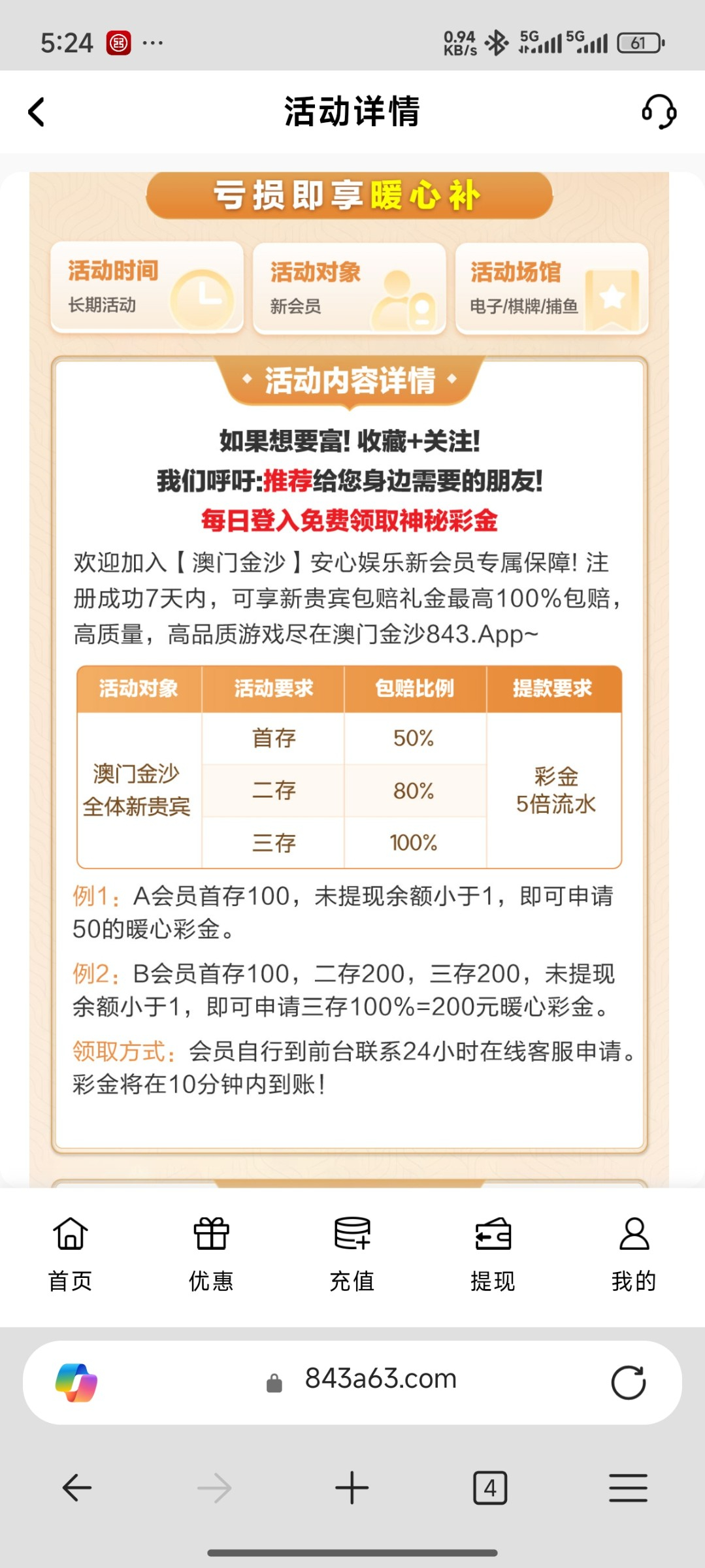 前面老哥发过以小博大40+50+的那个,刚才我仔细看了一下活动首存有一个存款送150%彩金的活动本金一倍彩金八倍,而且还开可以申请三次包赔,第一次申请50%第二次申请充值80%,第三次申请充值100%