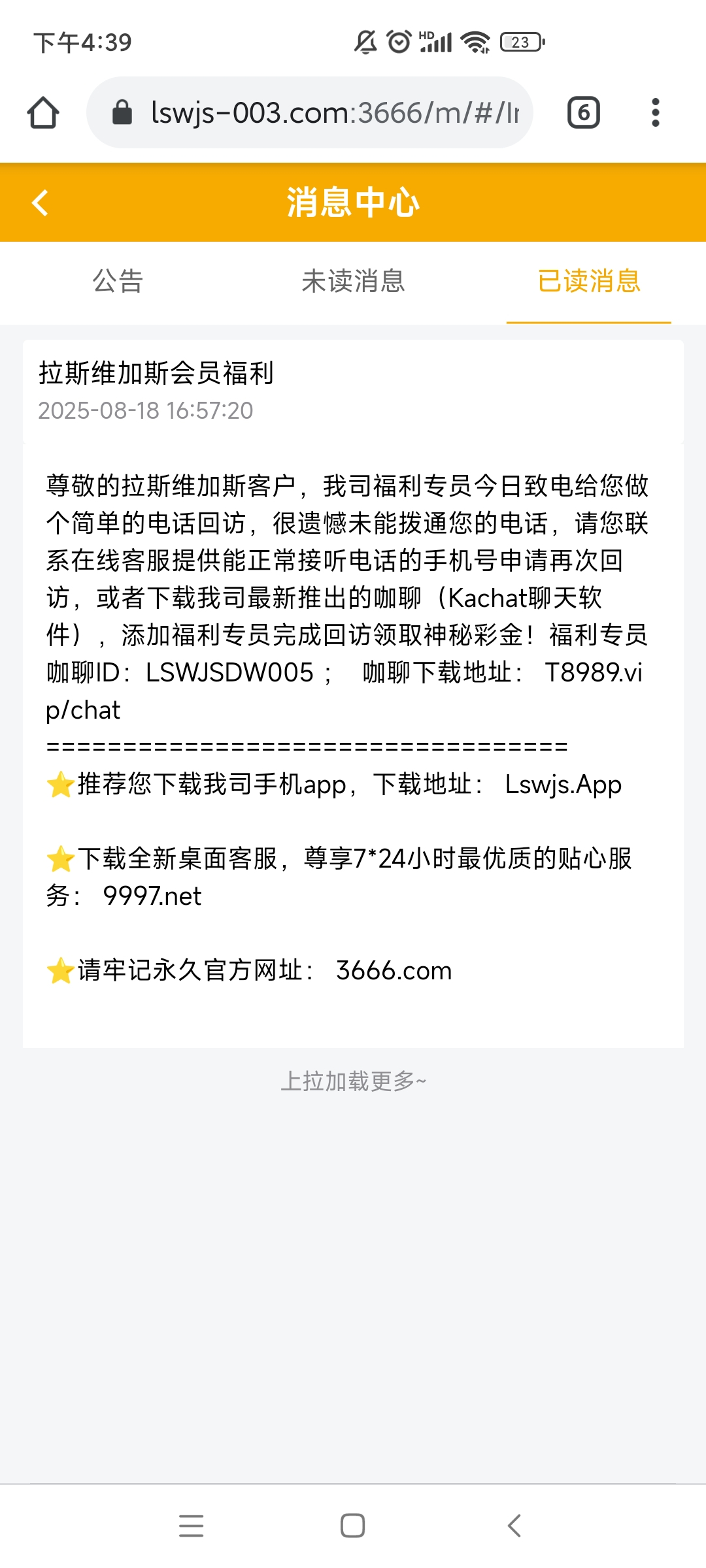 收到站内信联系客服,说不方便接电话,被反诈中心监控,他会让你下载两个APP软件让你发截图派送38,历史有充值记录的领到彩金去百家乐过三四关再充100打100流水在提现,这煞笔台子超过半个月不充值天王老子vip13来了也得留下100充值里面才能出款,耍小聪明藏免费的别试了,