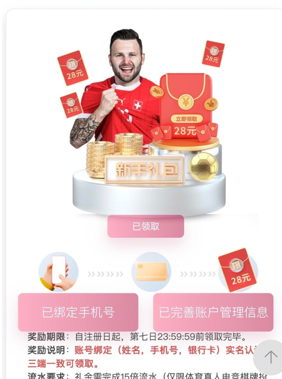 新用户注册绑卡绑定手机号,看图优惠中心自助领取28/100提,彩金只能玩体育真人棋牌。