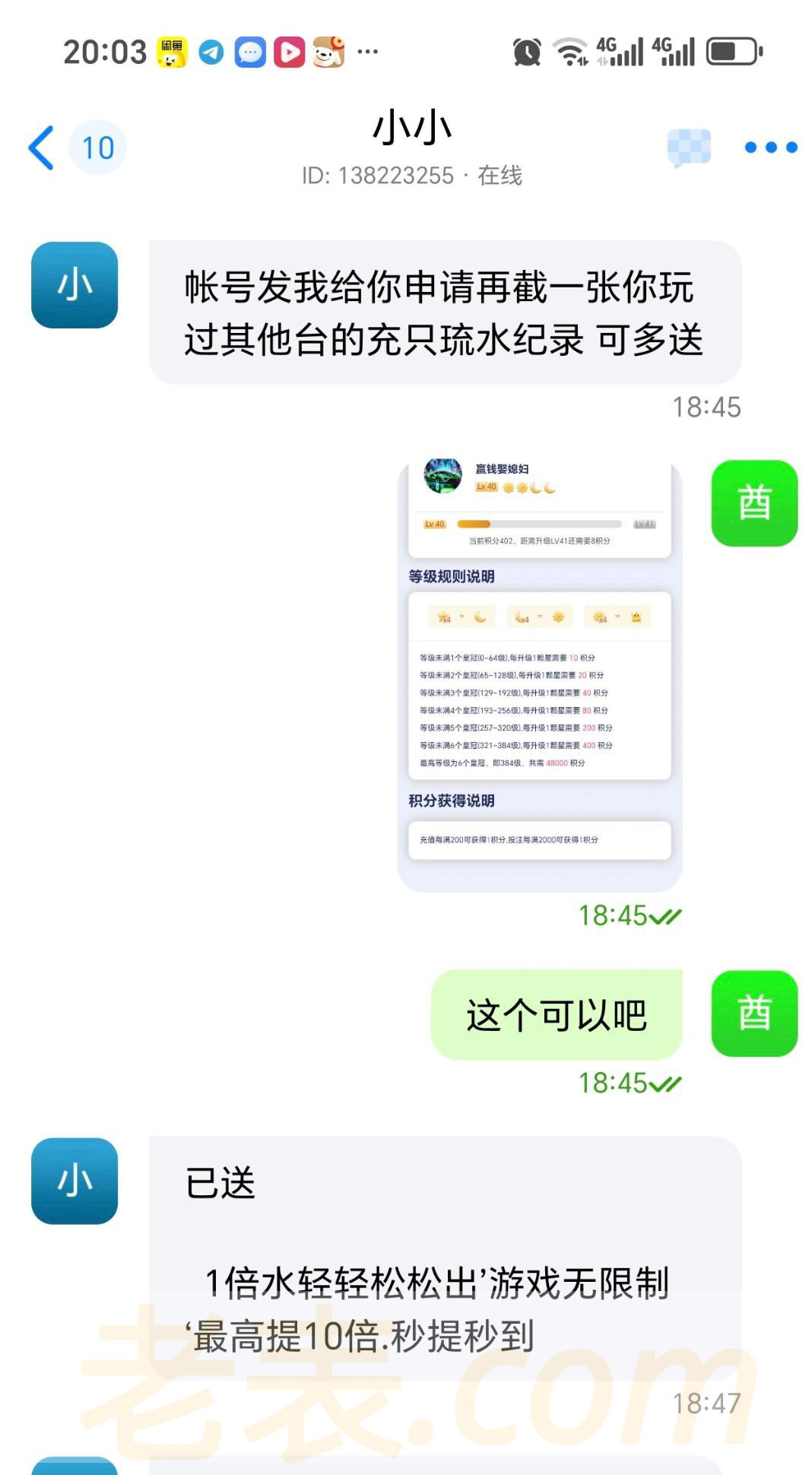 特邀网址14t.fuzhlnx.top 打开联系蝙蝠或者三条客服领取他会给你发注册网址和邀请码 给他一张其他平台的流水截图就行我给的是28圈等级截图送了48一杯流水提款最高提彩金10倍我没打出来 赶紧去现在应该不查
