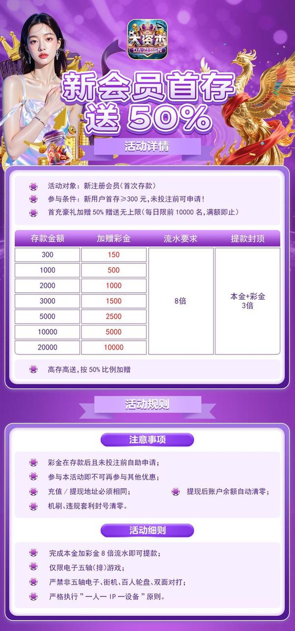 新用户存送50%优惠大厅自助领取(具体规则看图)